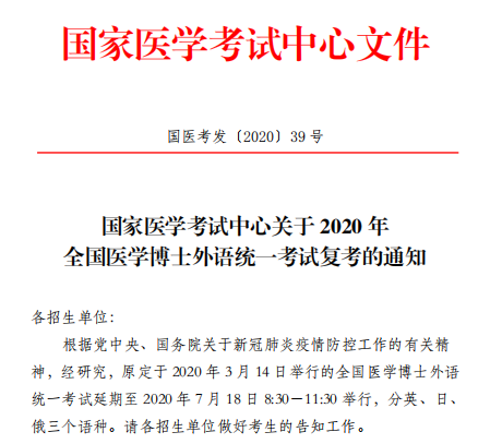 根据《国家医学考试中心文件》的通知安排,我校2020年博士研究生招生考试时间暂定为2020年7月18日和19日两天,后期考试时间如有变动,我校会在研究生院官网另行通知,请及时关注。