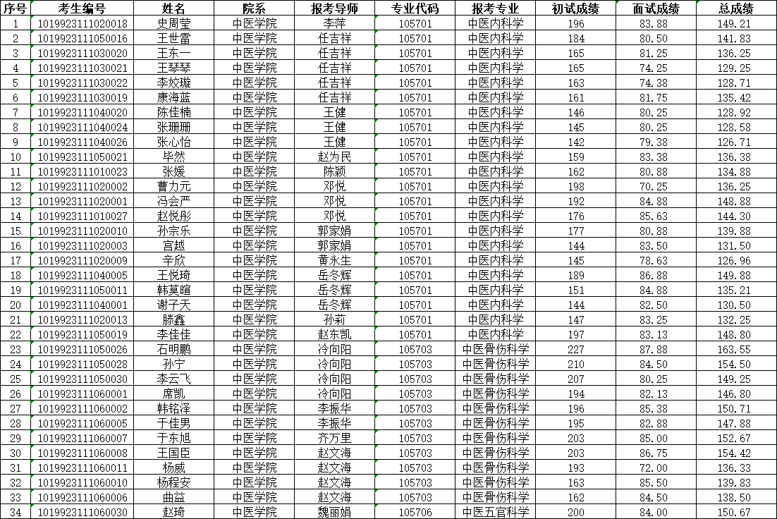 长春中医药大学2023年中医学院博士研究生入学考试部分专业第一轮复试成绩公示(三)